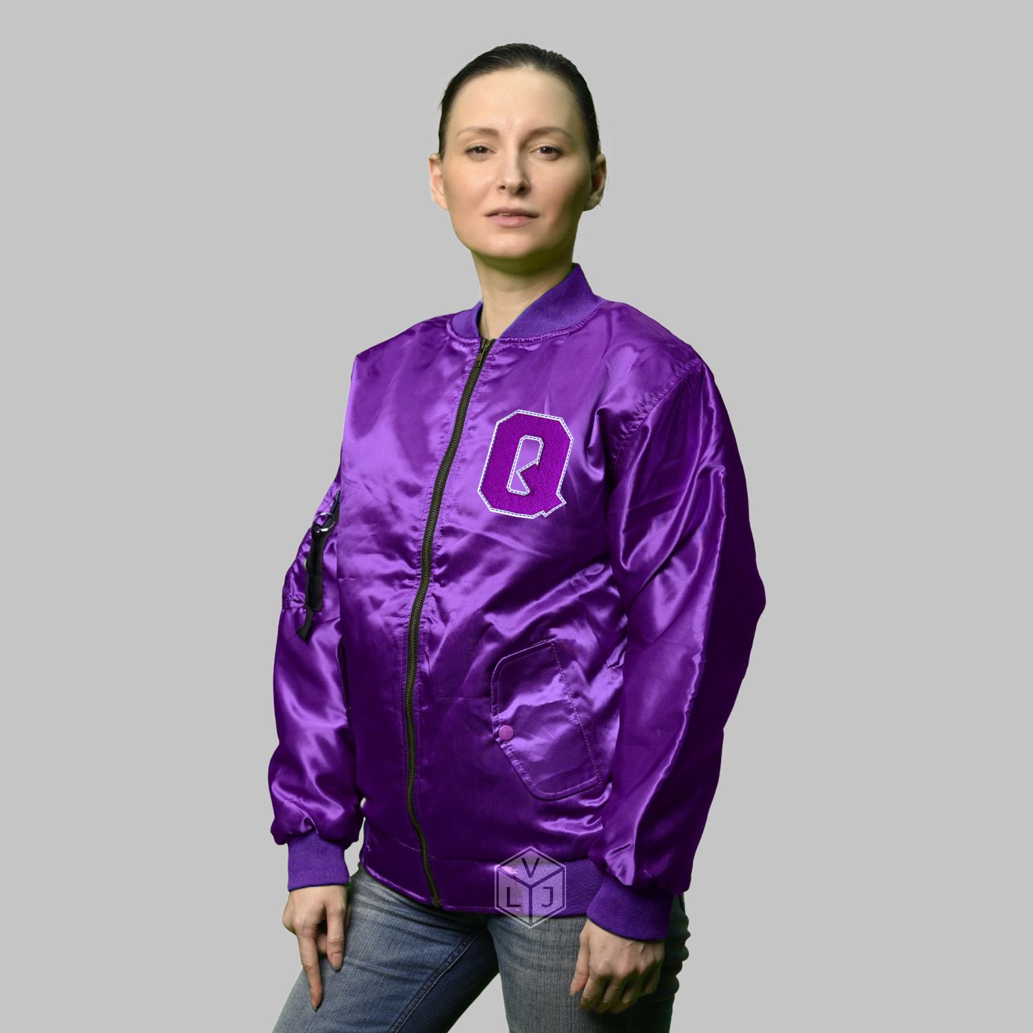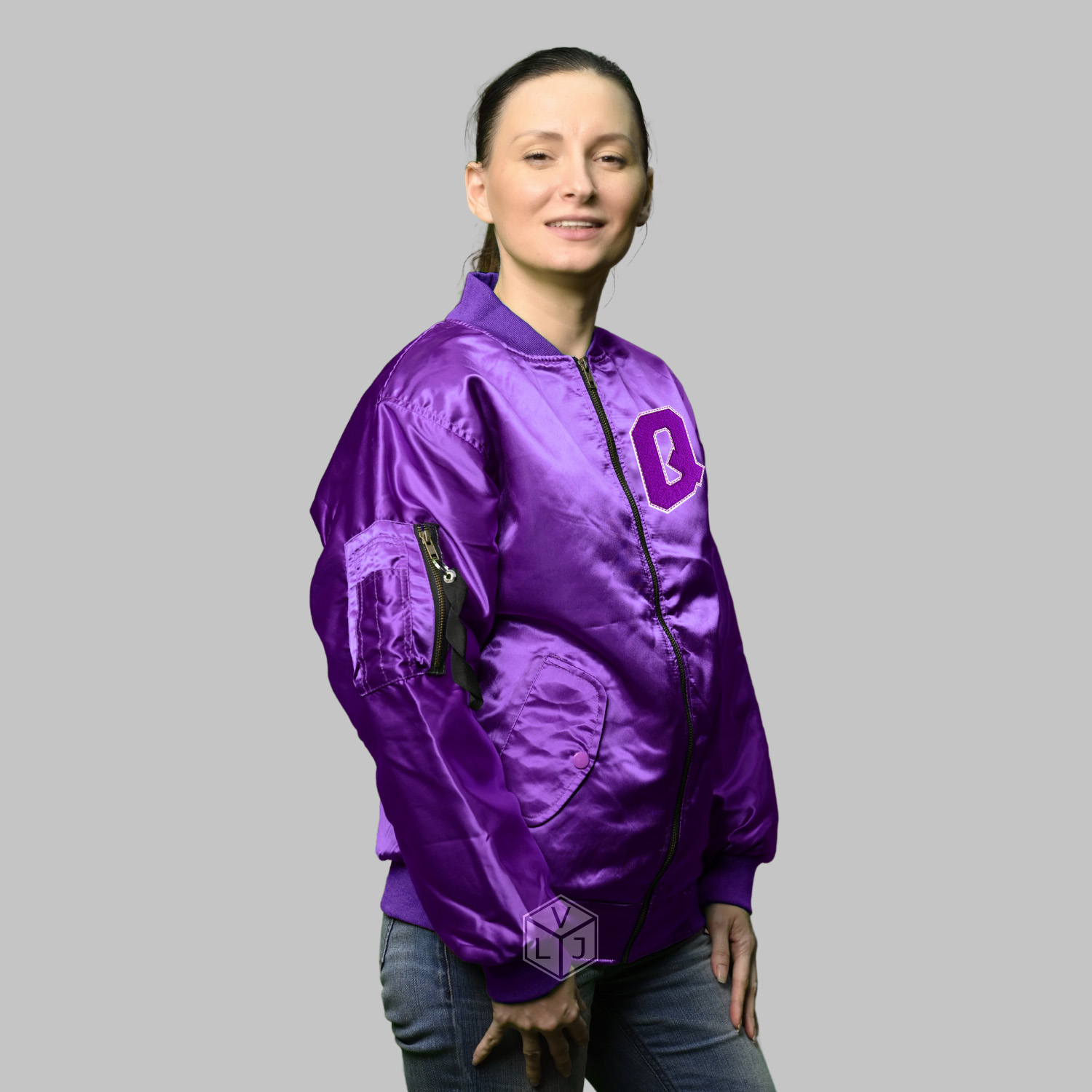Bomber Jackets Women are made of the world’s finest materials Satin Polyester body and sleeves purple. We use a fluffy 200 GSM inside center and a plain polyester fabric lining. 100% acrylic cotton ribbing is used on the collar, cuffs, and waistband in purple color. We use the best quality Brass zipper on the front closure and sleeve pocket, two varsity snaps are used on the front pocket closure of purple.