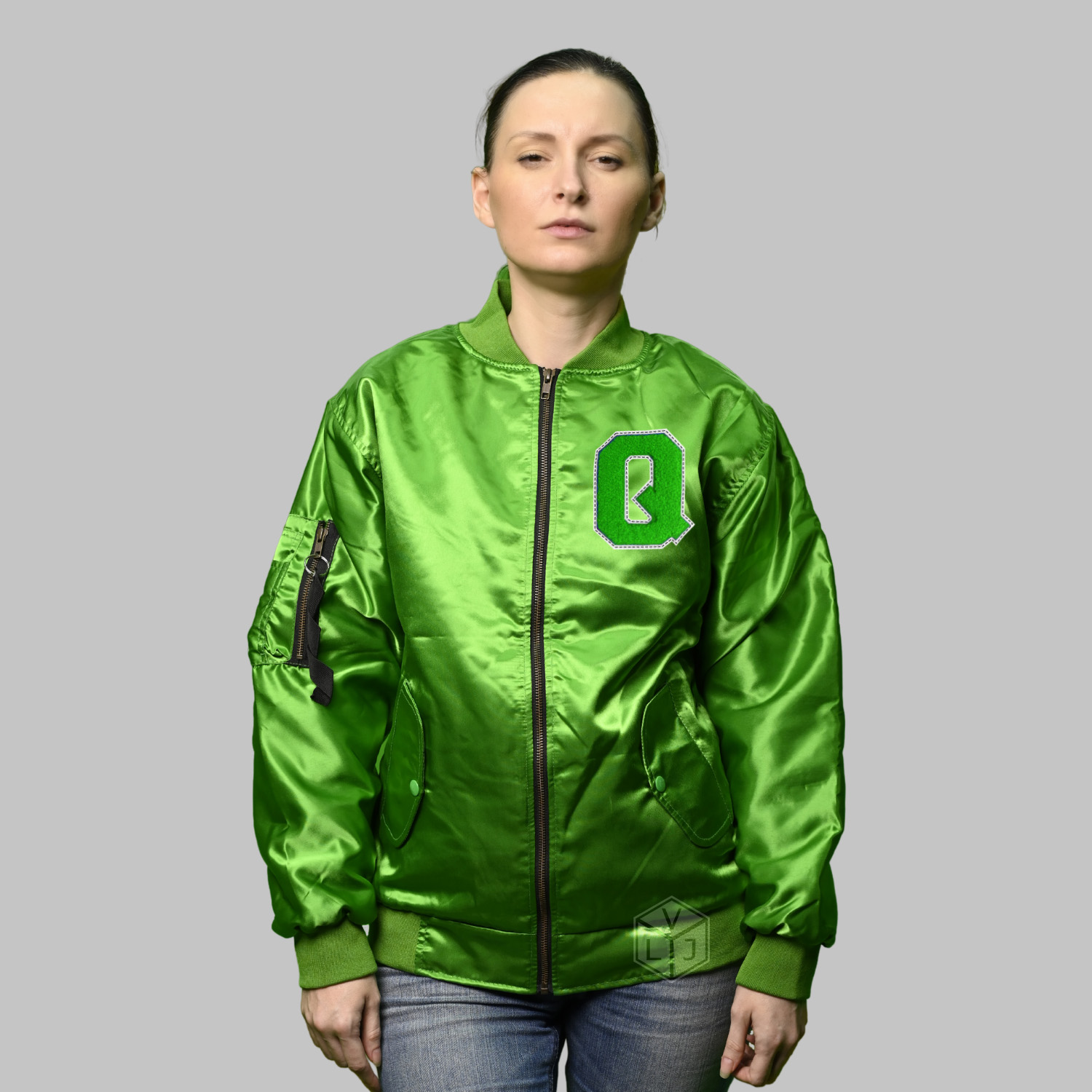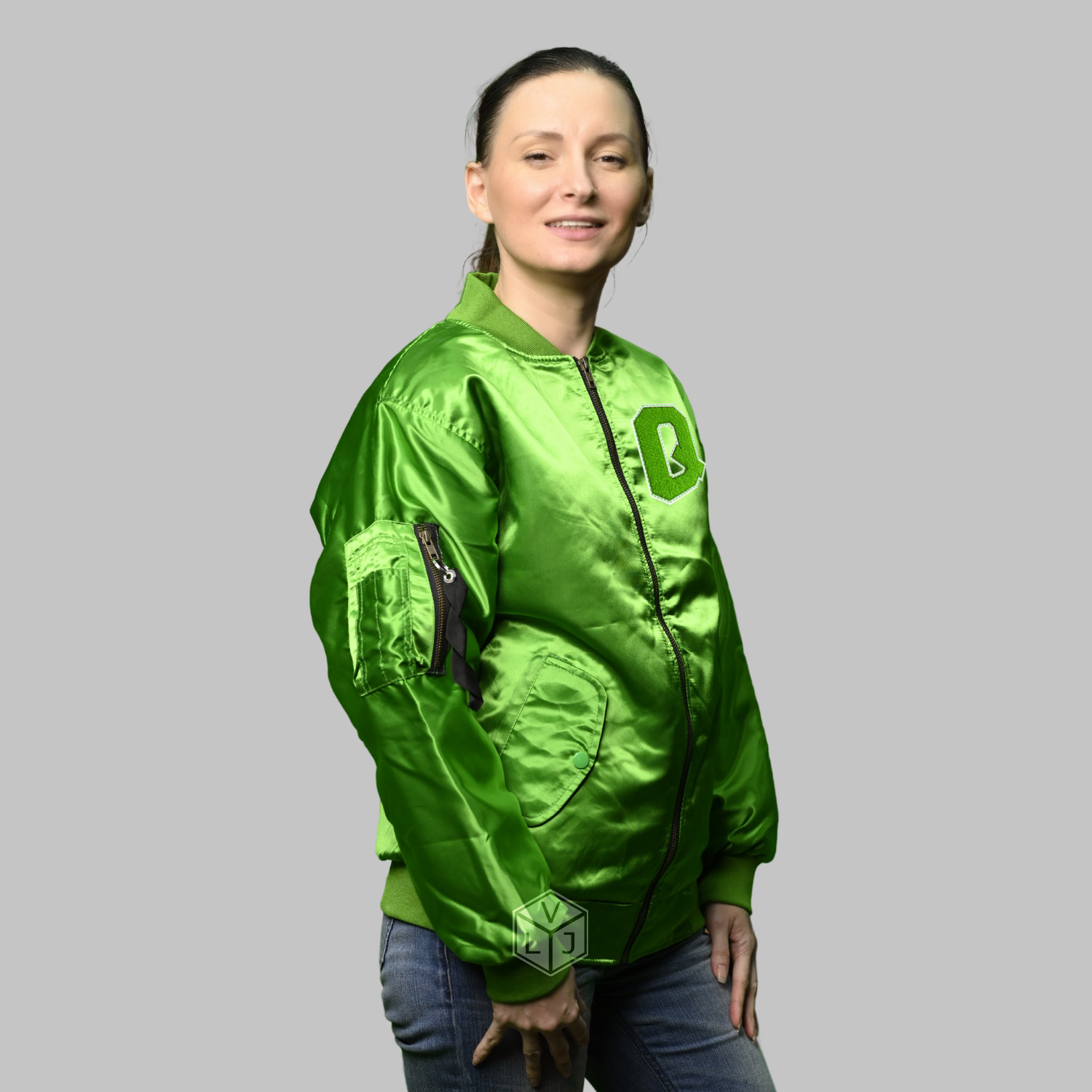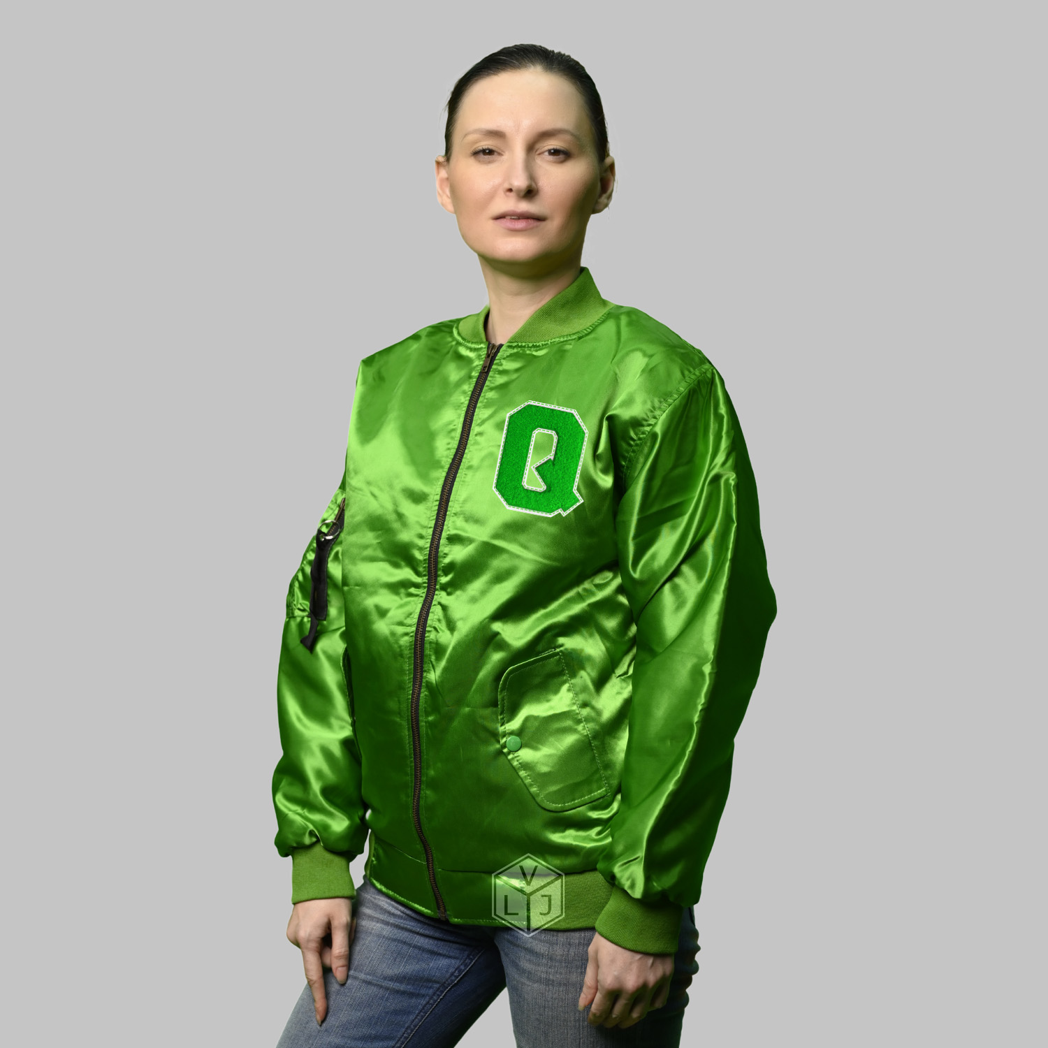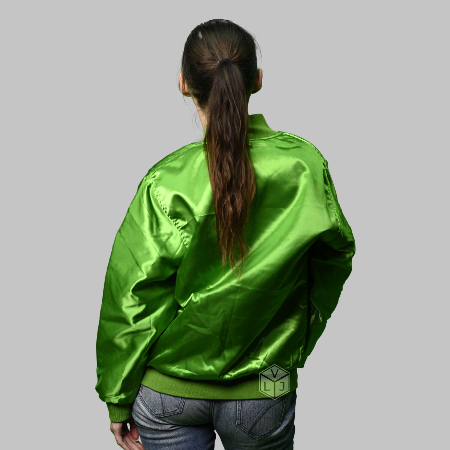 Bomber Jackets are made of the world’s finest materials Satin Polyester body and sleeves color green. We use inside center fluffy 200 GSM and plain lining of polyester fabric. 100% acrylic cotton ribbing is used on the collar, cuffs, and waistband in green color. We use the best quality Brass zipper on the front closure and sleeve pocket, two varsity snaps are used on the front pocket closure of color green.