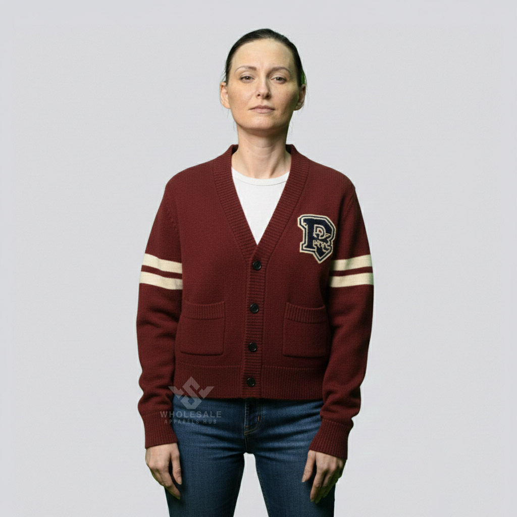 Crafted with high-quality acrylic, wool-blend, or cotton-knit fabrics, the College Cardigan for Women balances comfort, warmth, and durability.