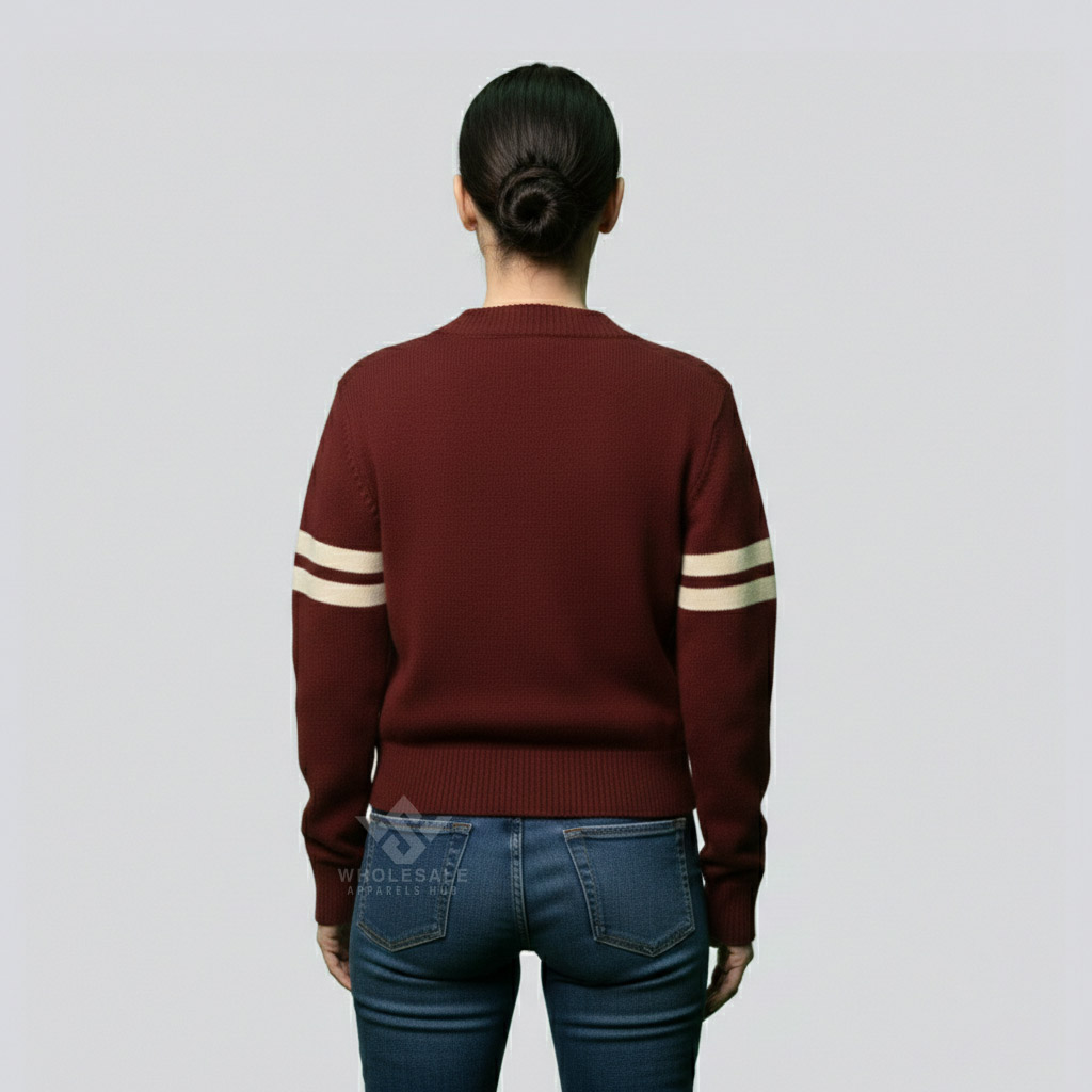 A stylish knit sweater inspired by collegiate and varsity fashion, designed specifically for women with letterman-style detailing.