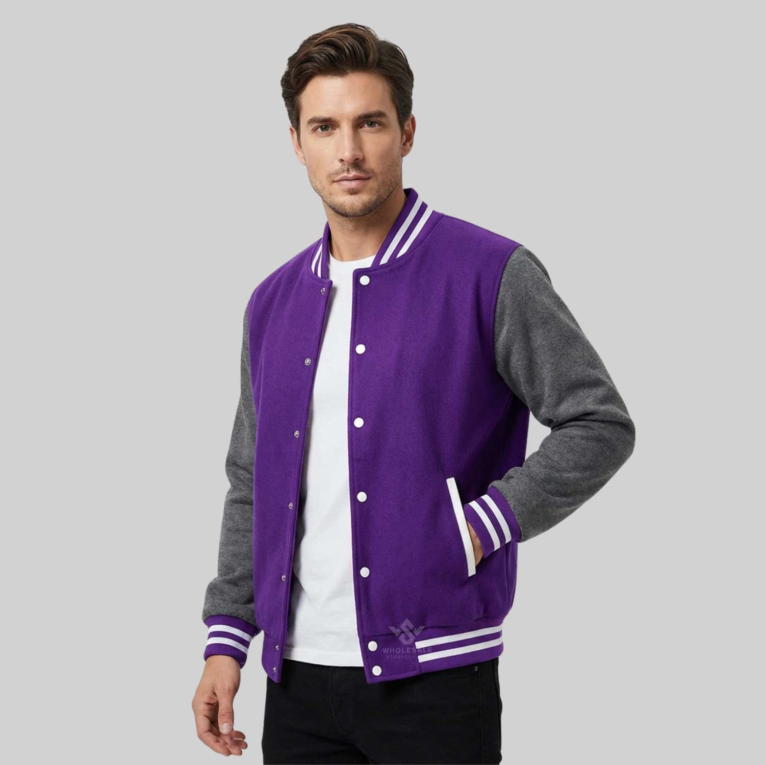The Grey And Purple Wool Varsity Jacket blends classic varsity heritage with a bold modern color combination. Designed for fashion retailers, apparel brands, and wholesale buyers, this jacket delivers premium comfort, long-lasting durability, and standout streetwear appeal.