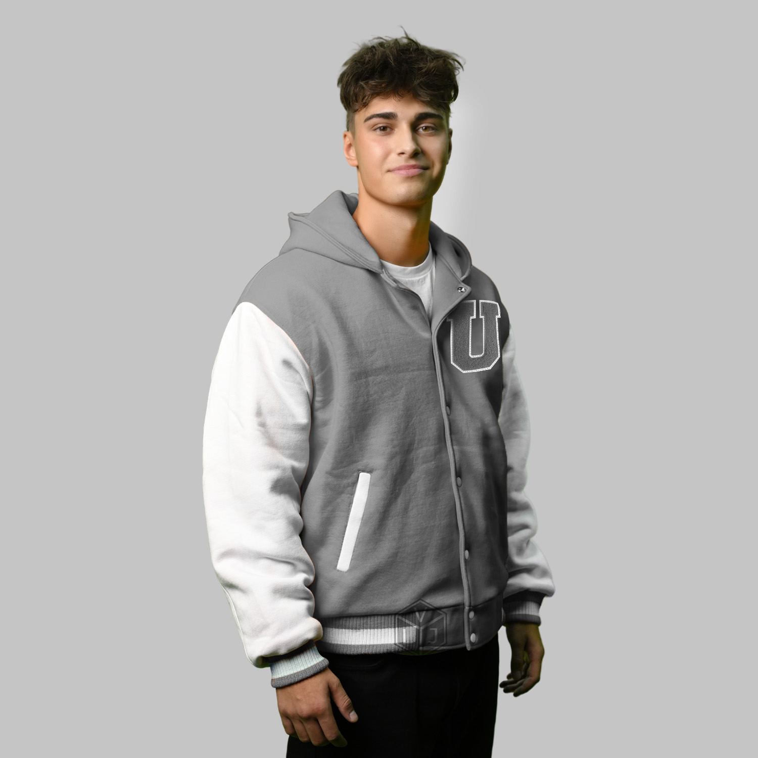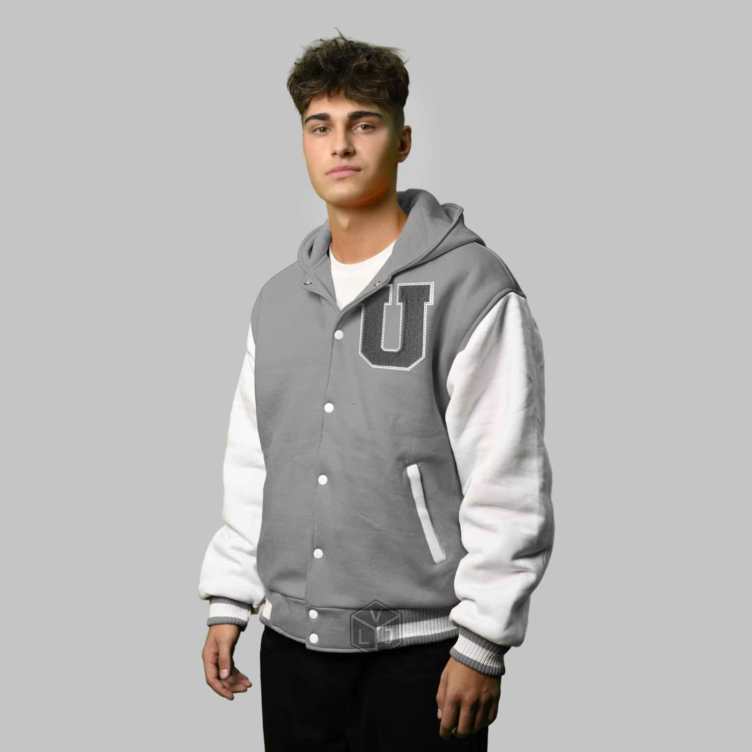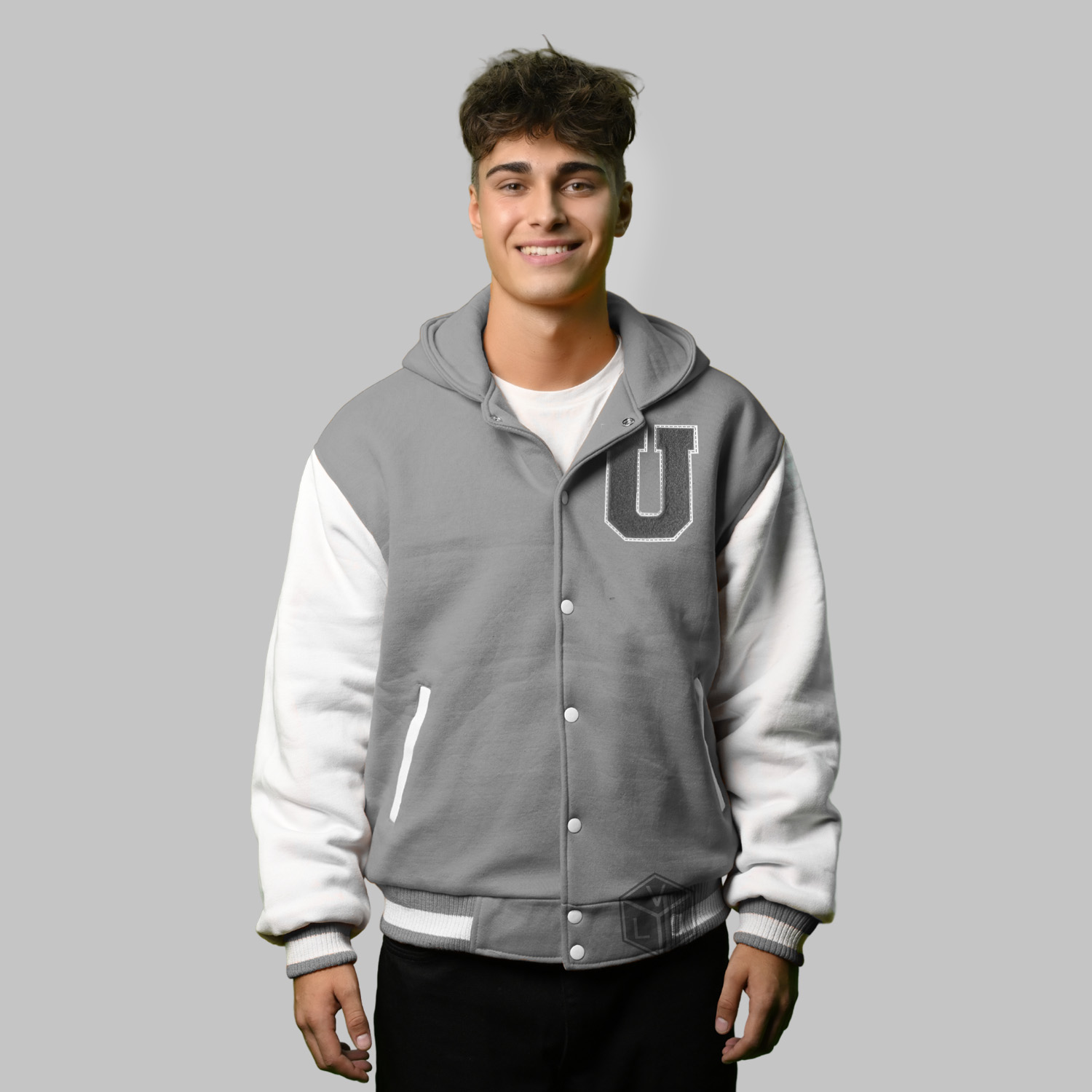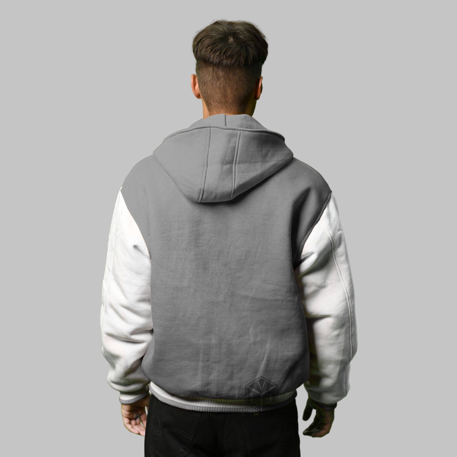 Hooded Letterman jackets is produced in the World’s best high-quality combination of materials, Cotton Fleece body Grey, and sleeves color in White. Buy this varsity jacket for men/women as it is or you can design your own jacket through our design tools.
