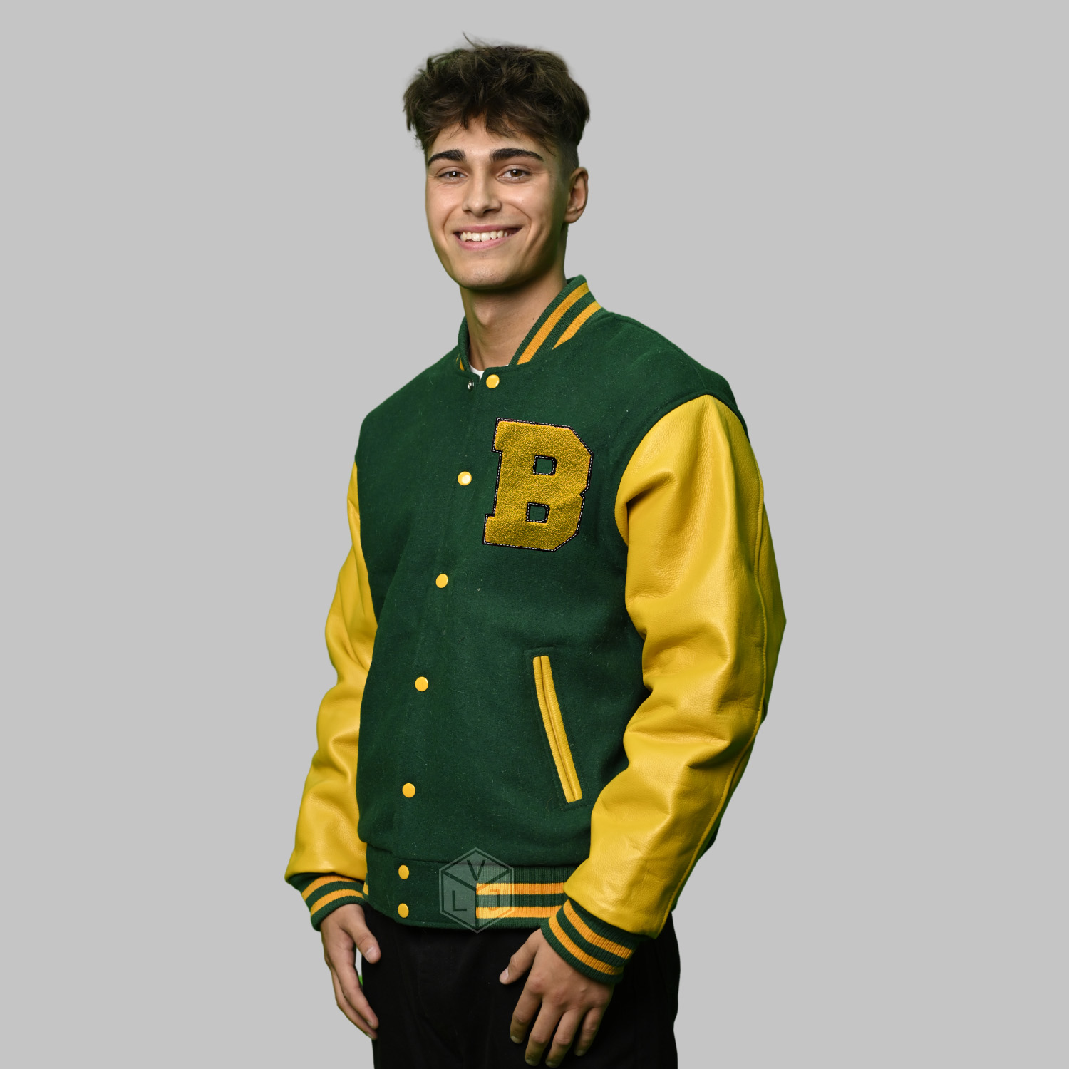 Letterman Jacket are produced in the World’s best high-quality combination of materials, wool body color green and sleeves color yellow. Buy this varsity jacket for Men and Women as it is or you can design your own jacket through our design tools.