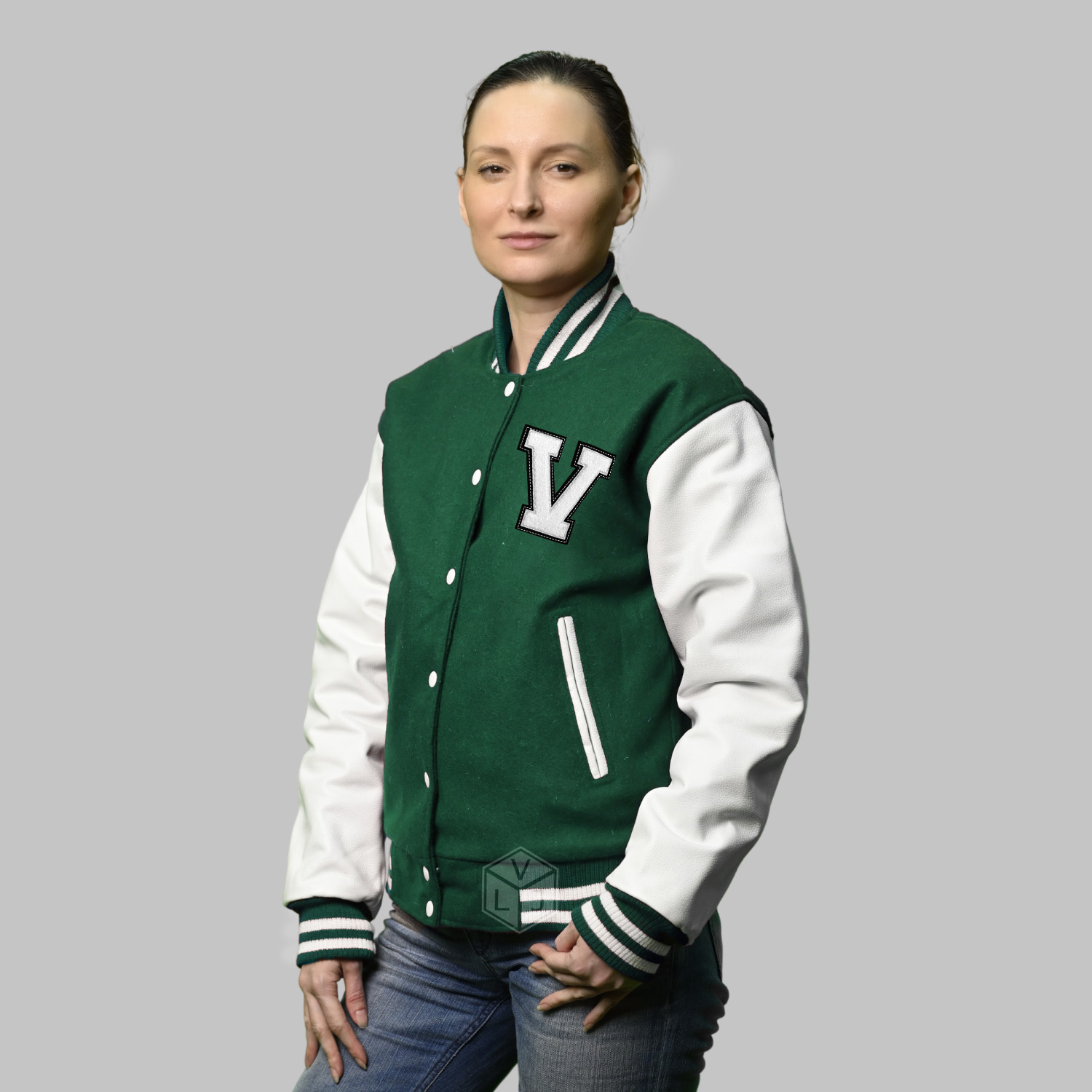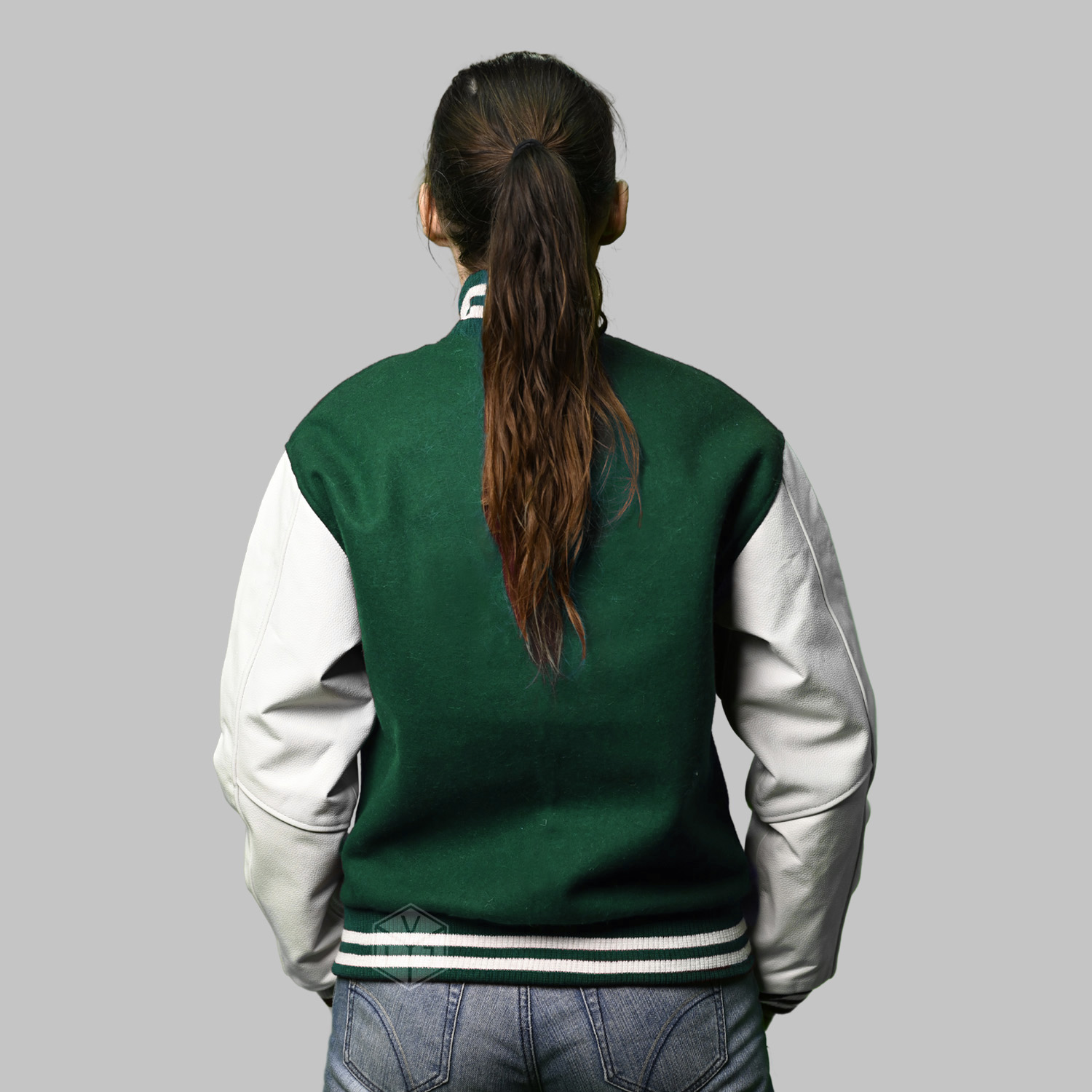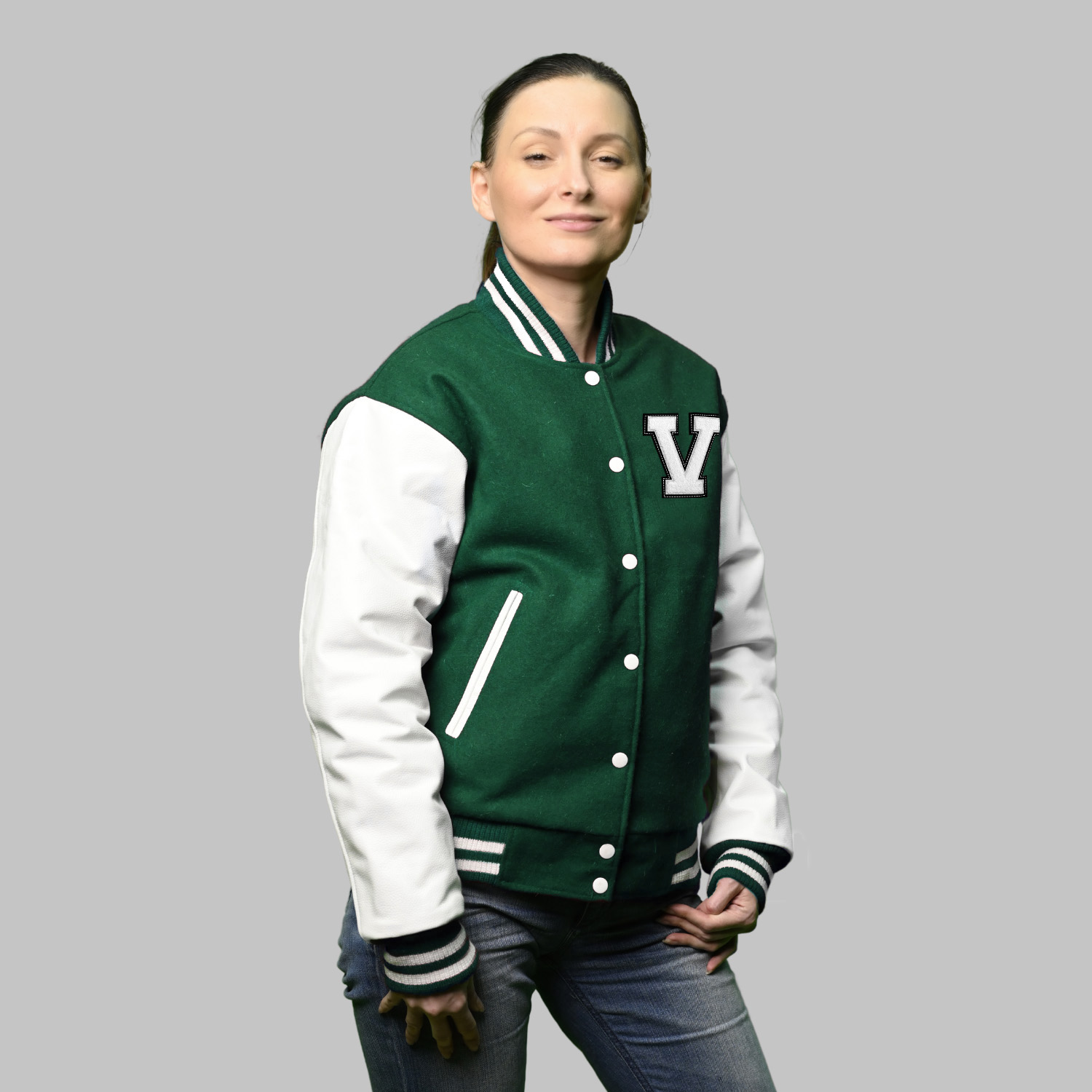 Letterman Varsity Jacket women produced in World’s best high quality combination of materials, wool body color Green and sleeves color white. Buy this varsity jacket for men/women as it is or you can design your own jacket through our design tools.