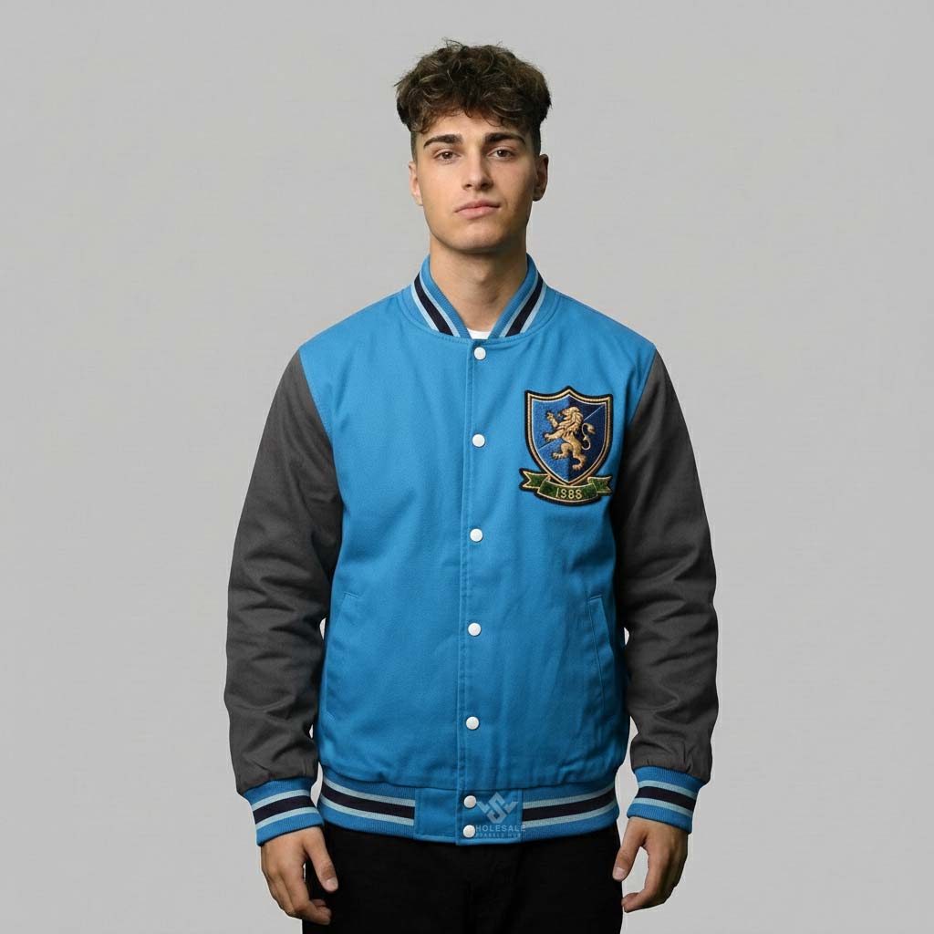 Premium Men Custom Varsity Jacket Wholesale crafted from wool, cotton, or fleece for durability, comfort, and timeless varsity style. Fully customizable with embroidery, chenille patches, printed logos, and private-label branding. Available in men’s S–5XL with scalable bulk production and custom color options. Ideal for fashion brands, schools, teams, and retail stores seeking high-quality wholesale men’s varsity jackets.