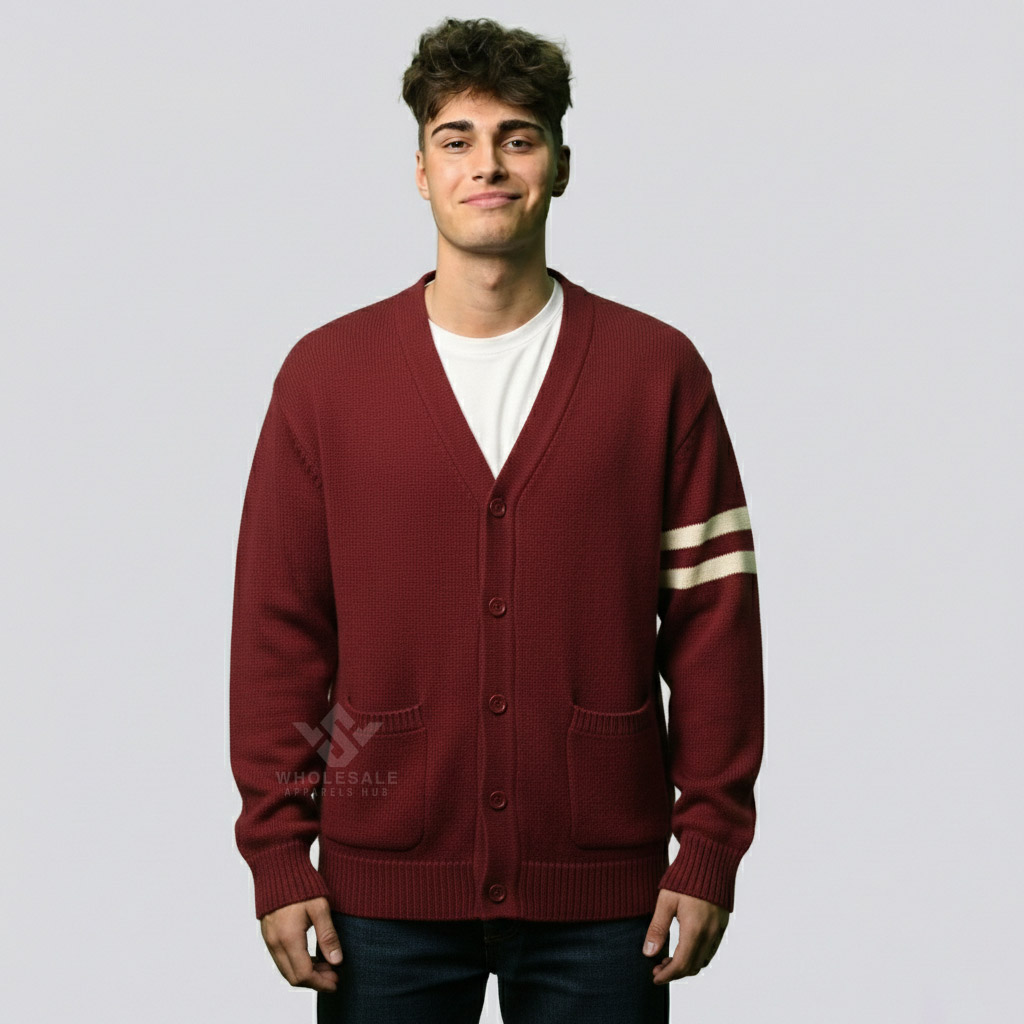Discover our Varsity Cardigan for Sale, blending classic letterman heritage with modern knitwear comfort. Featuring ribbed cuffs, button-front closure, and varsity-inspired patches, this cardigan is perfect for campus fashion, casual streetwear, or team apparel. Fully customizable with color combinations and embroidery, it offers versatile styling for men, women, and groups seeking timeless, comfortable, and stylish knitwear.