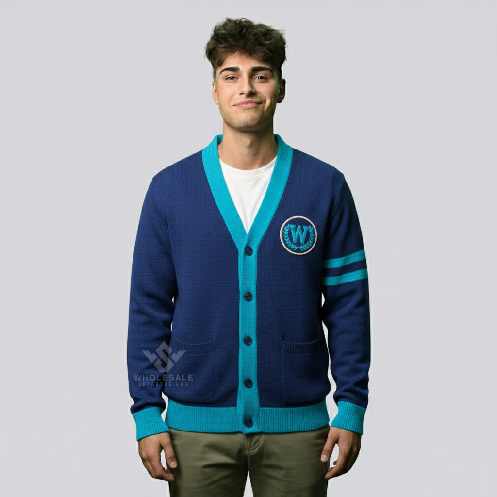 Discover our Varsity Cardigan for Sale, blending classic letterman heritage with modern knitwear comfort. Featuring ribbed cuffs, button-front closure, and varsity-inspired patches, this cardigan is perfect for campus fashion, casual streetwear, or team apparel. Fully customizable with color combinations and embroidery, it offers versatile styling for men, women, and groups seeking timeless, comfortable, and stylish knitwear.