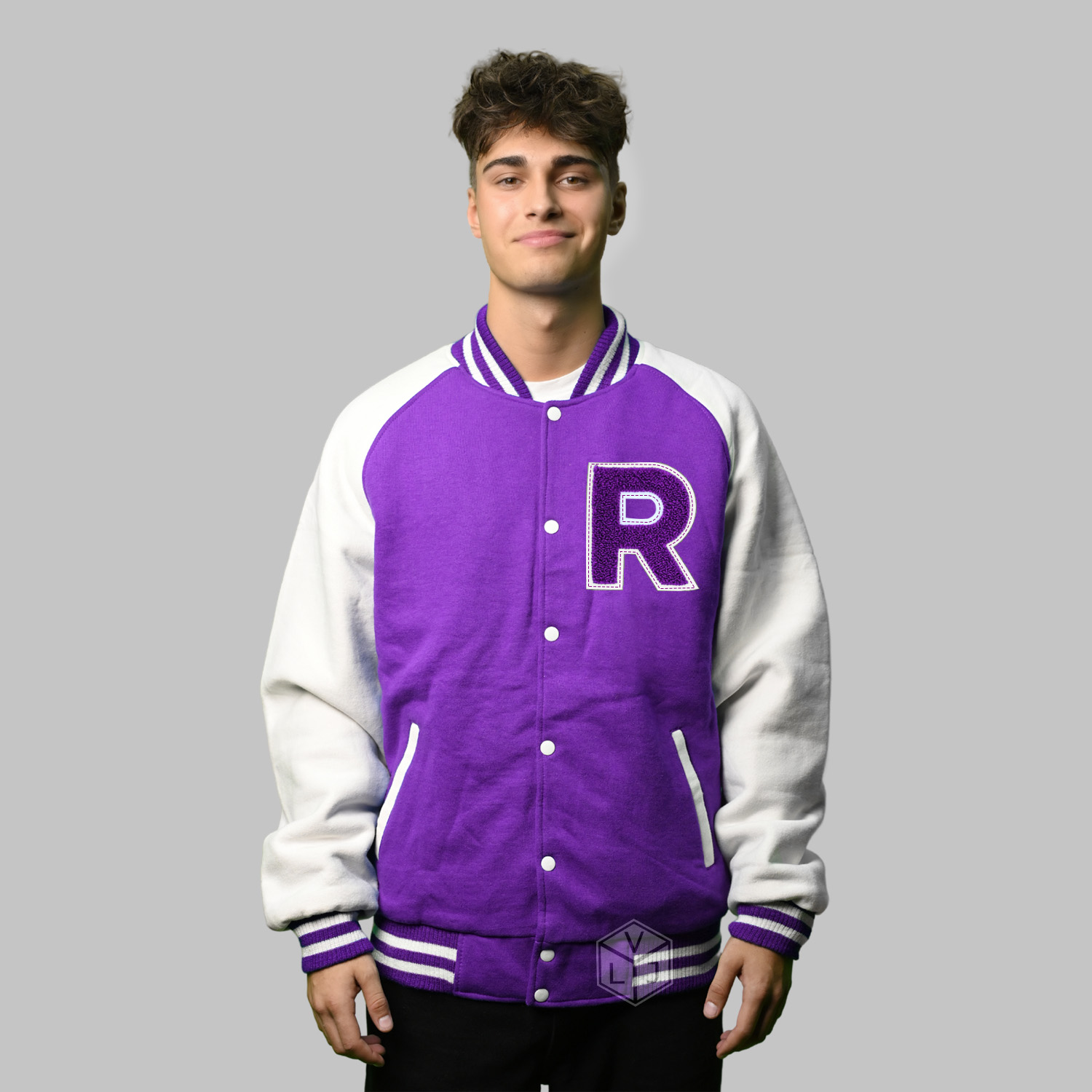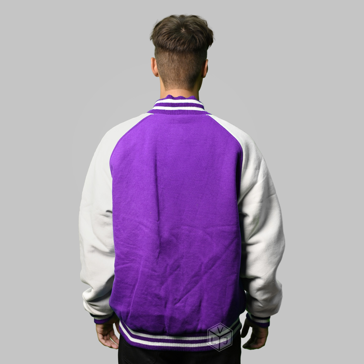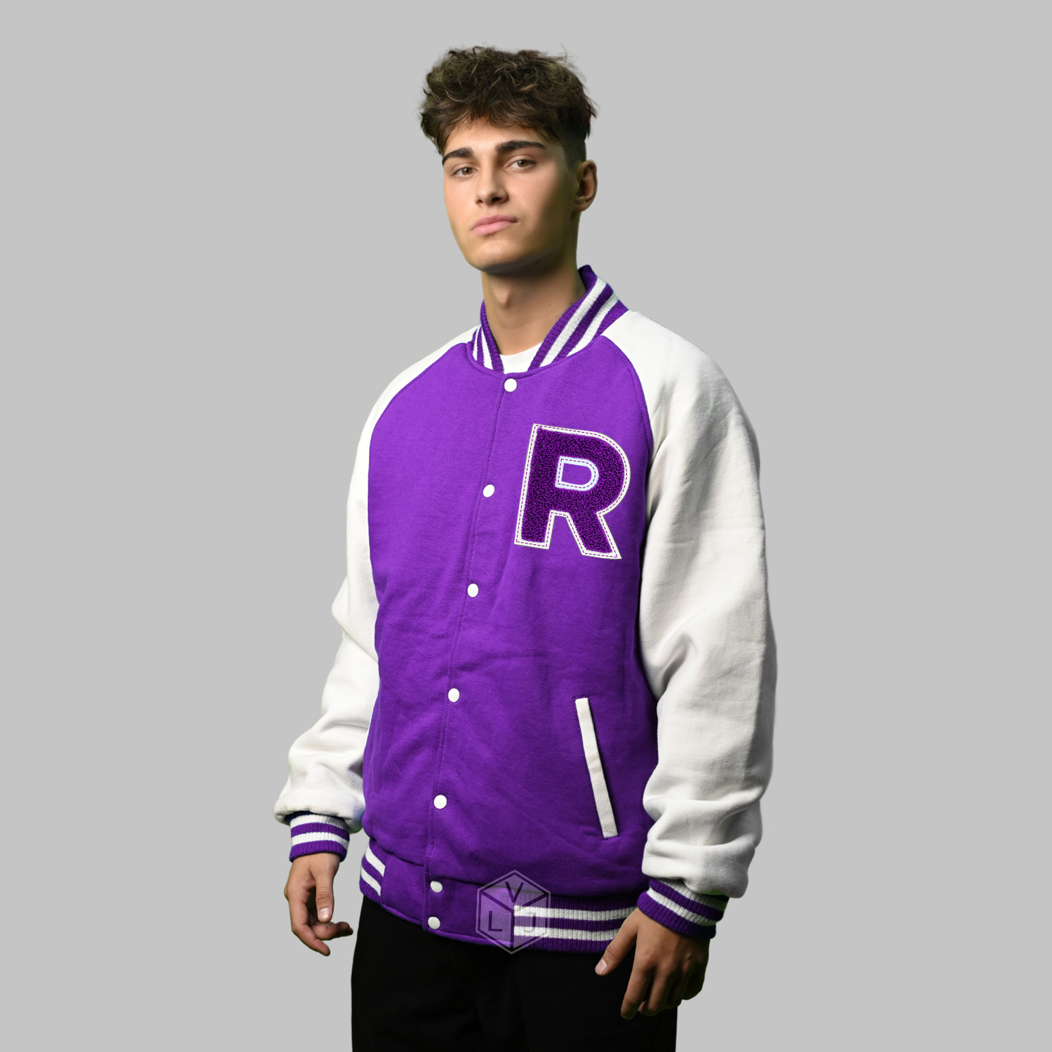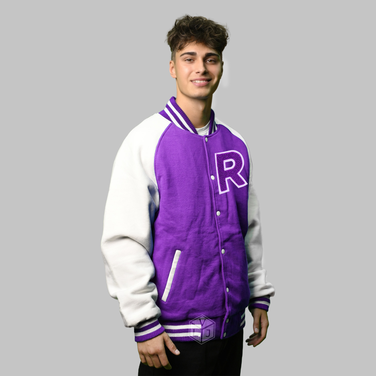 Raglan Letterman Jacket is produced in the World’s best high-quality combination of materials, Cotton Fleece body purple, and sleeves color in white. Buy this varsity jacket for men/women as it is or you can design your own jacket through our design tools.