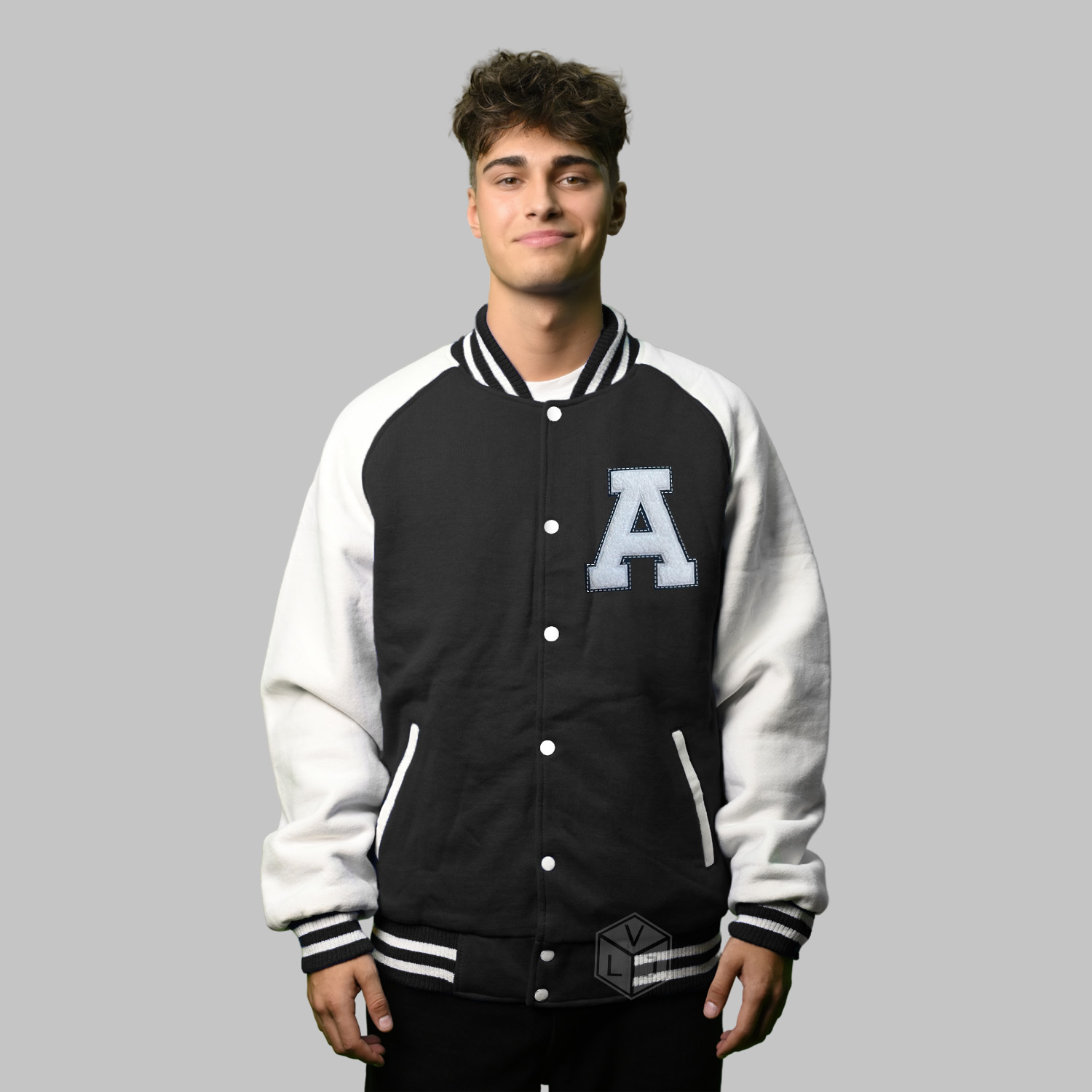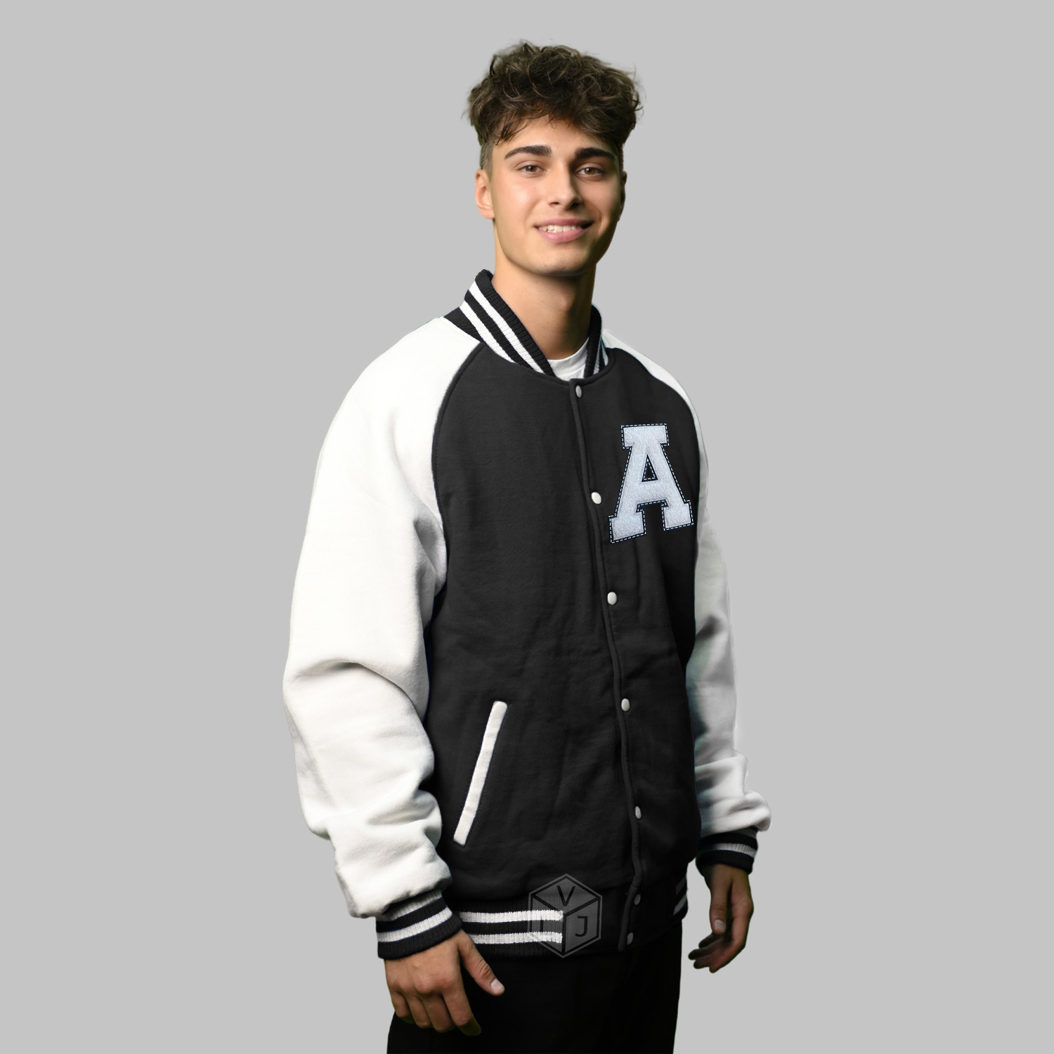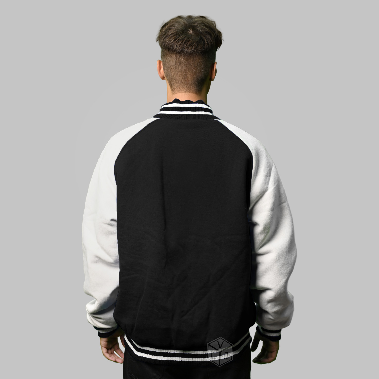 Raglan Sleeves Varsity Jackets is produced in the World’s best high-quality combination of materials, Cotton Fleece body black, and sleeves color in white. Buy this varsity jacket for men/women as it is or you can design your own jacket through our design tools.