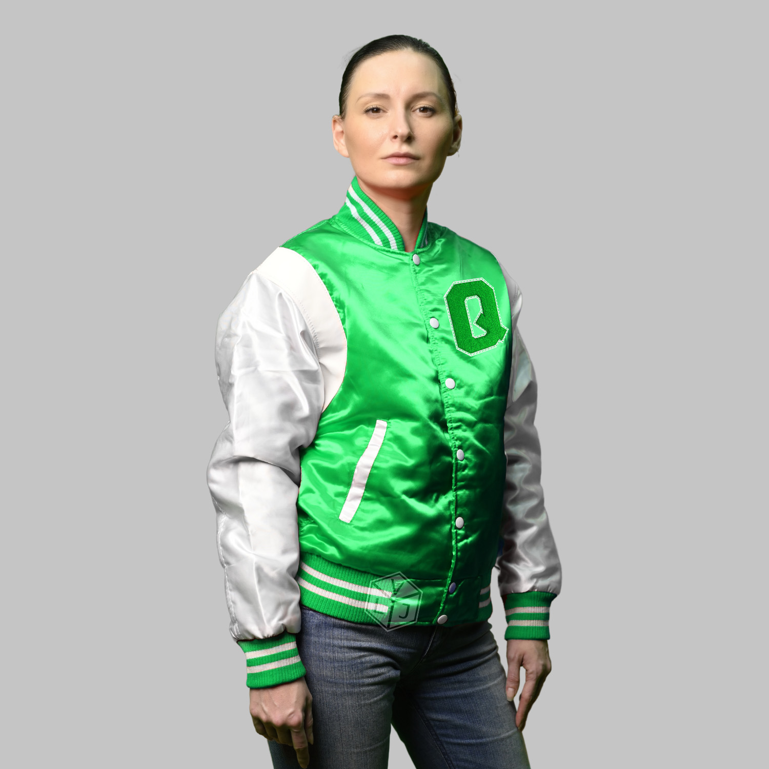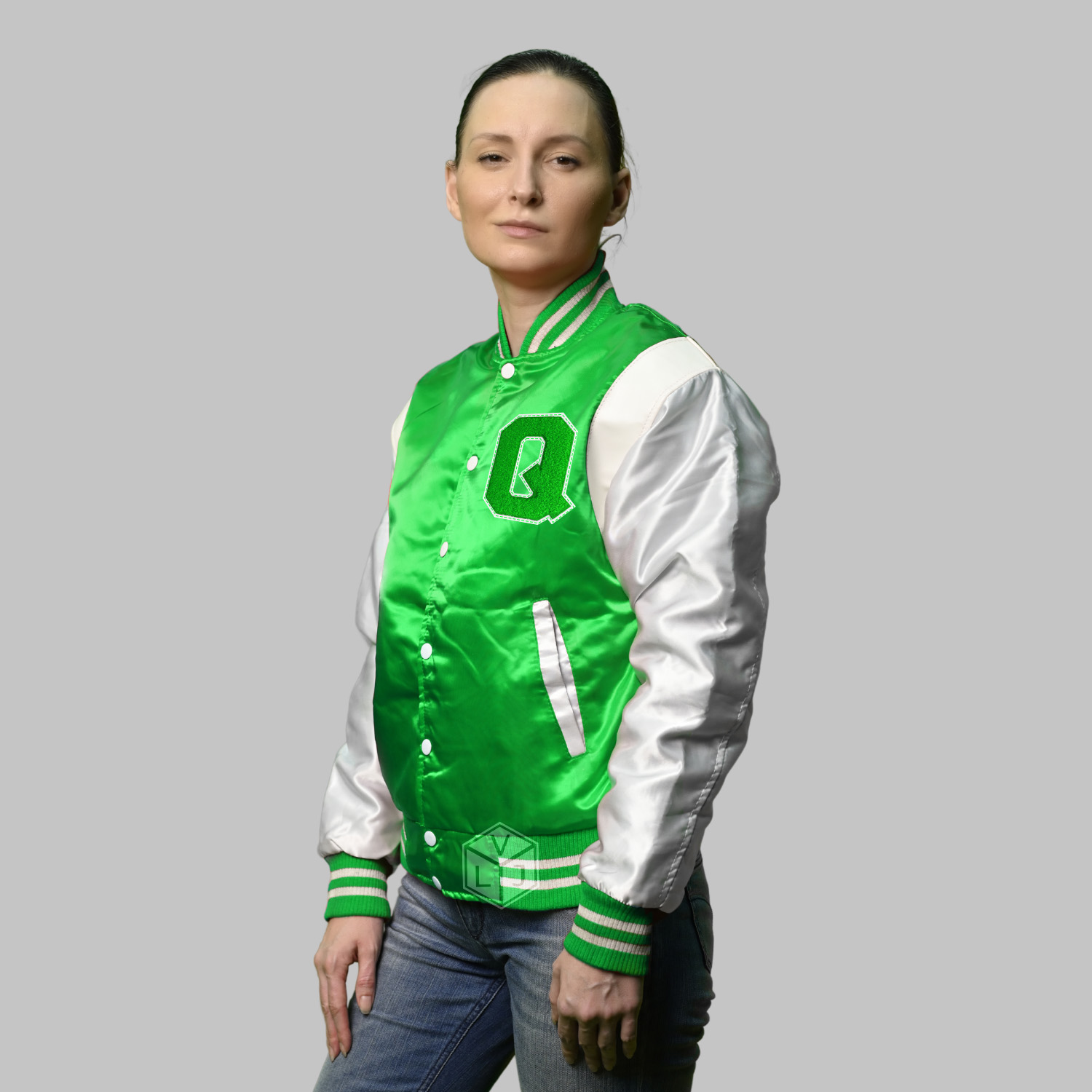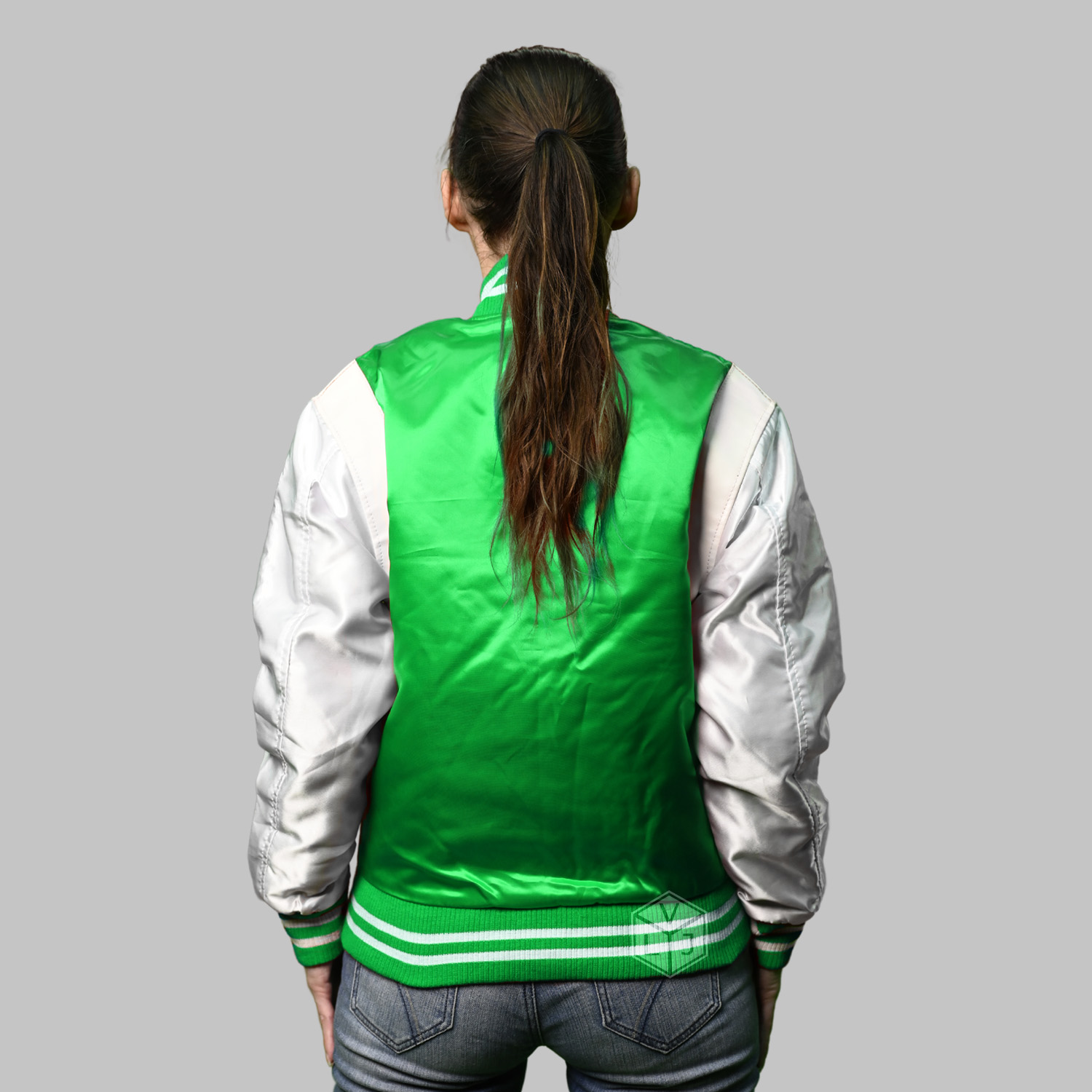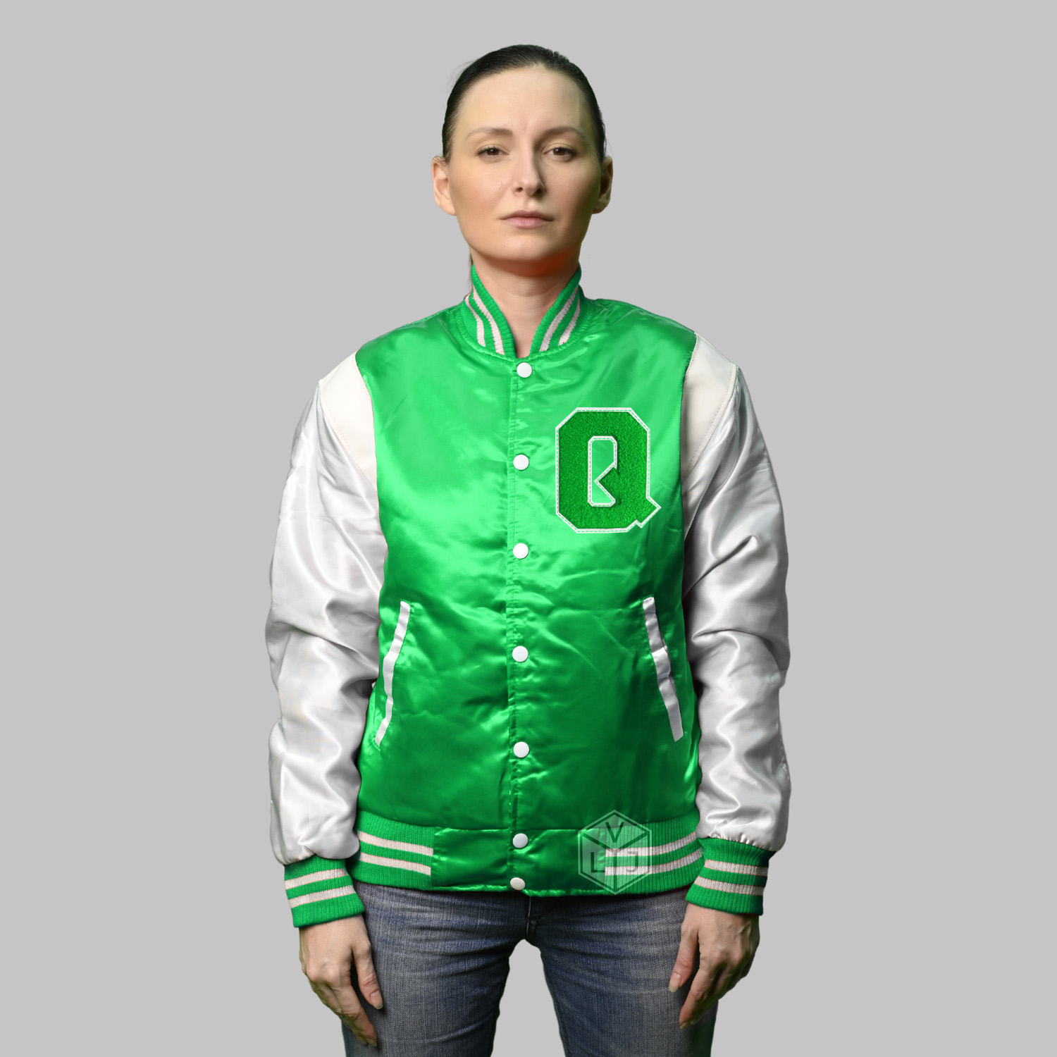 Satin Varsity Jacket is produced in the World’s best high-quality combination of materials, Polyester Satin body green and Sleeves in white. Buy this varsity jacket for Men Women & men as it is or you can design your jacket through our design tools.