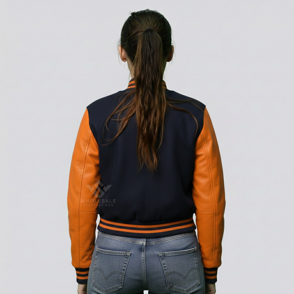 Designed for retailers, fashion brands, and apparel distributors, this jacket balances timeless varsity detailing with updated styling that resonates with today’s fashion-forward audience.