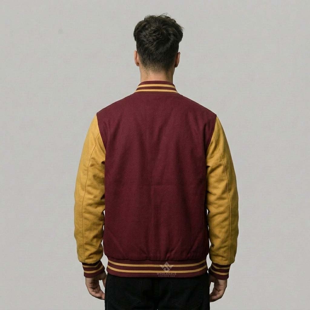 Premium Men Custom Varsity Jacket Wholesale crafted from wool, cotton, or fleece for durability, comfort, and timeless varsity style. Fully customizable with embroidery, chenille patches, printed logos, and private-label branding. Available in men’s S–5XL with scalable bulk production and custom color options. Ideal for fashion brands, schools, teams, and retail stores seeking high-quality wholesale men’s varsity jackets.