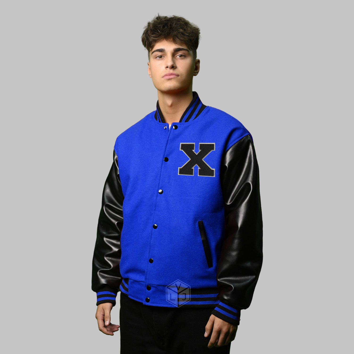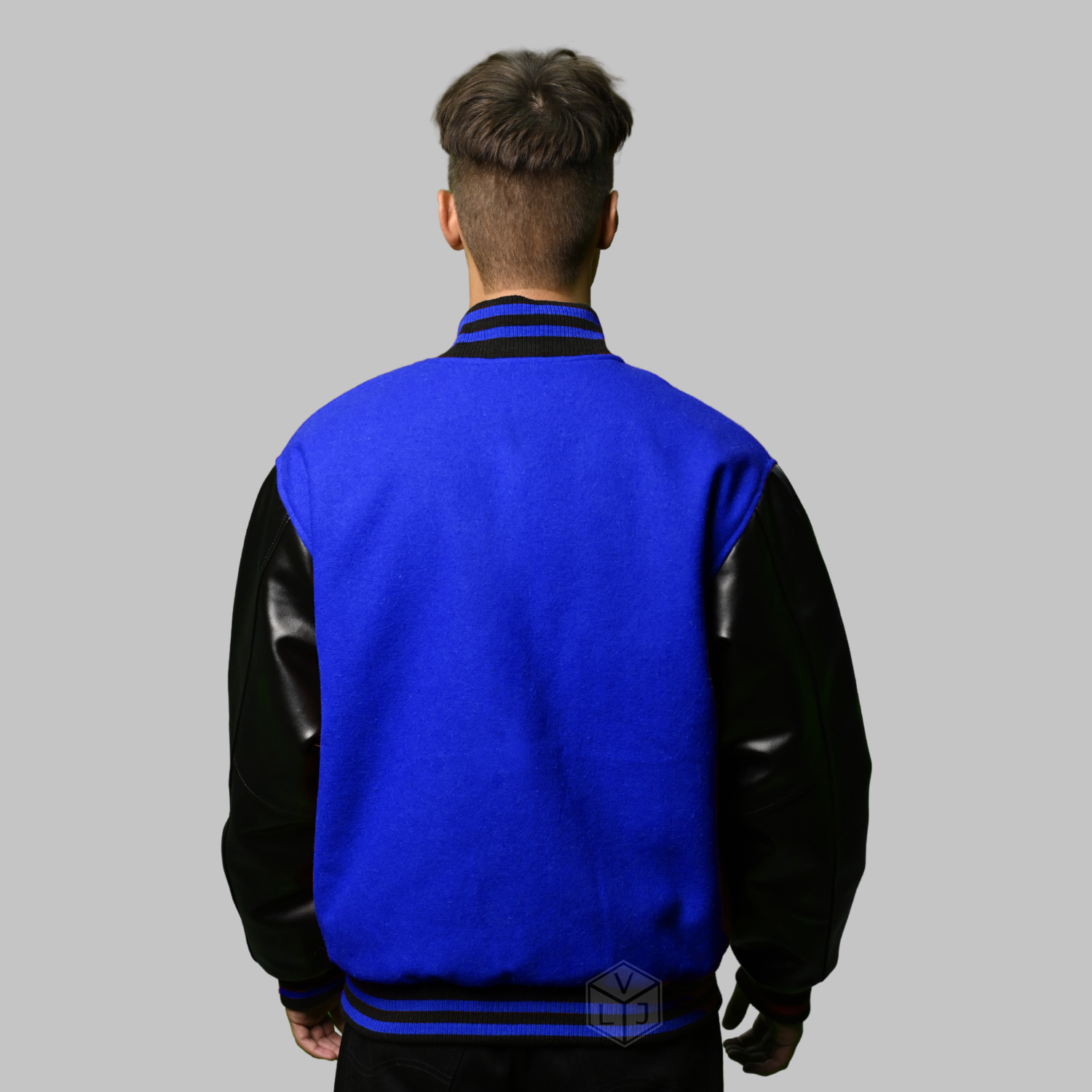 Varsity Customized Jacket produced in World’s best high quality combination of materials, wool body color Royal Blue and sleeves color Black. Buy this varsity jacket for men/women as it is or you can design your own jacket through our design tools.