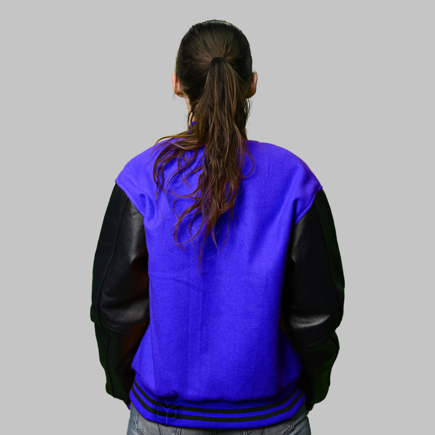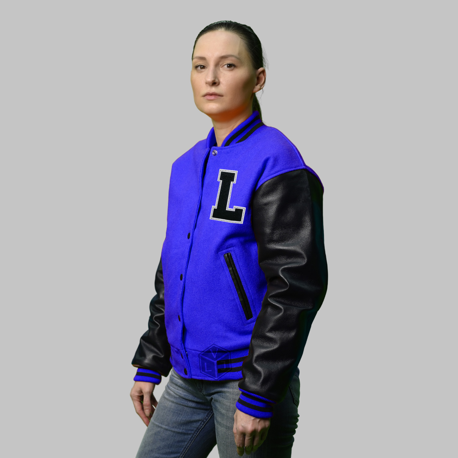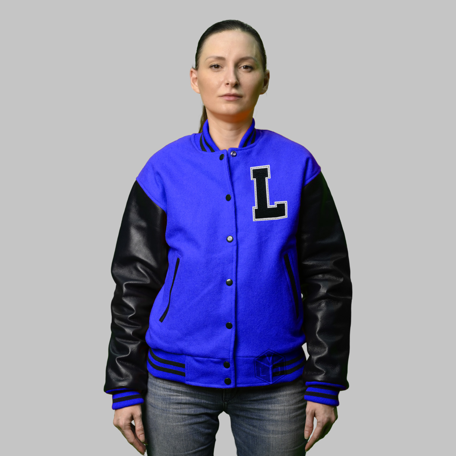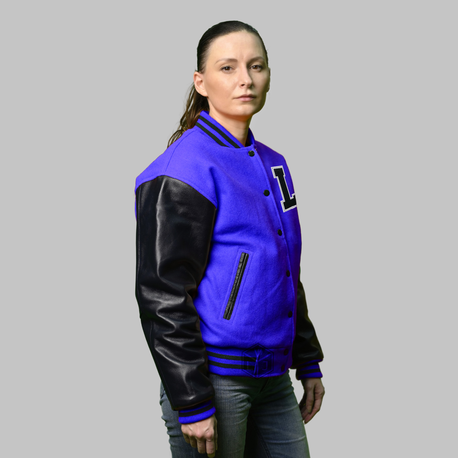 Varsity Jacket Classic produced in World’s best high quality combination of materials, wool body color royal blue and sleeves color black. Buy this varsity jacket for women as it is or you can design your own jacket through our design tools.