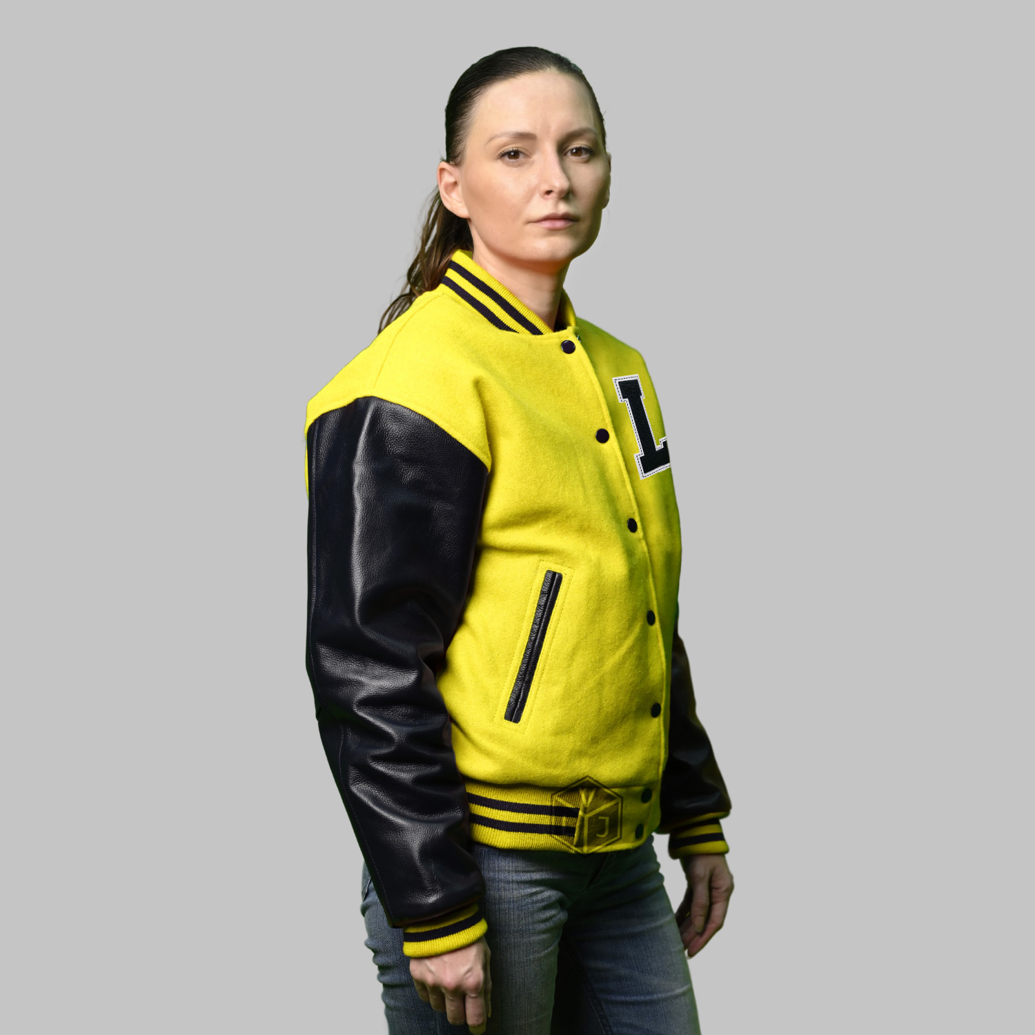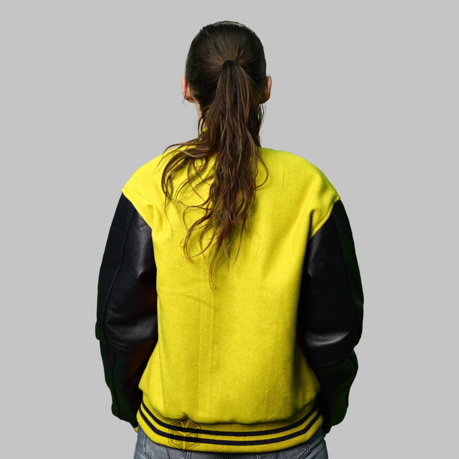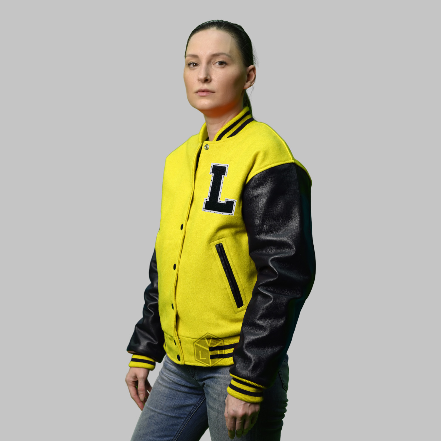 Varsity Jacket Leather wool produced in World’s best high quality combination of materials, wool body color yellow and sleeves color black. Buy this varsity jacket for women as it is or you can design your own jacket through our design tools.