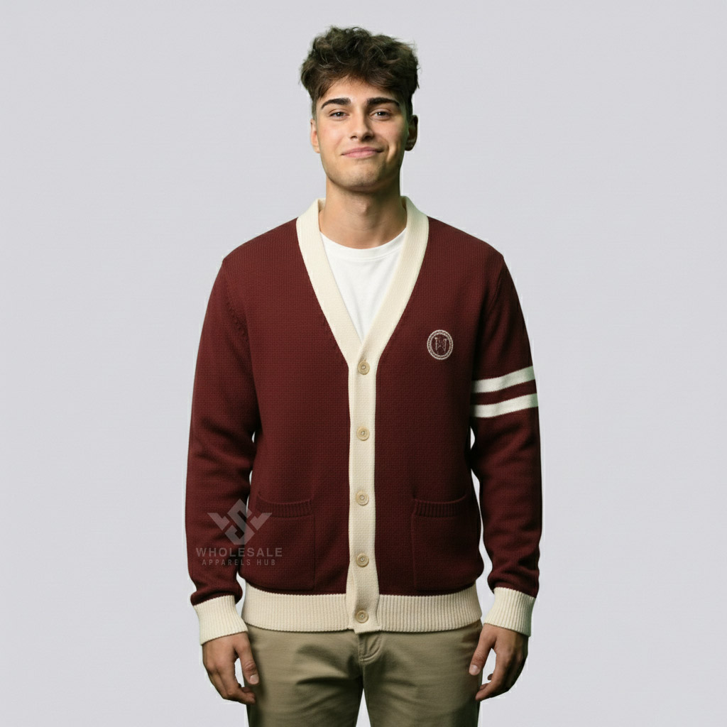 Each warm varsity cardigan is crafted using high-quality knit fabrics such as acrylic or blended yarns that are selected for insulation, softness, and long-term wear.