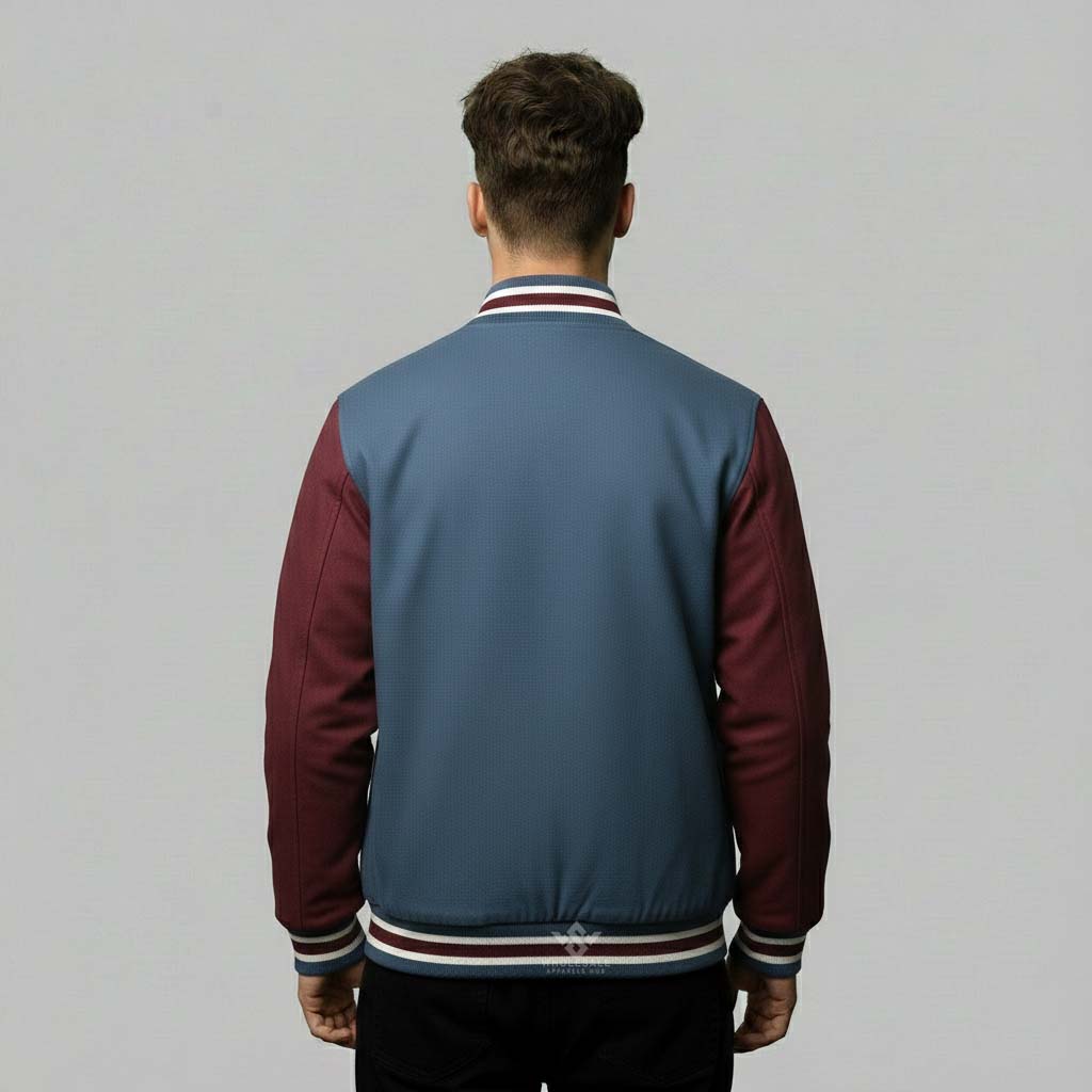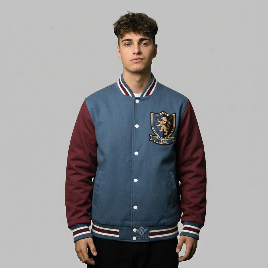 Premium Men Custom Varsity Jacket Wholesale crafted from wool, cotton, or fleece for durability, comfort, and timeless varsity style. Fully customizable with embroidery, chenille patches, printed logos, and private-label branding. Available in men’s S–5XL with scalable bulk production and custom color options. Ideal for fashion brands, schools, teams, and retail stores seeking high-quality wholesale men’s varsity jackets.